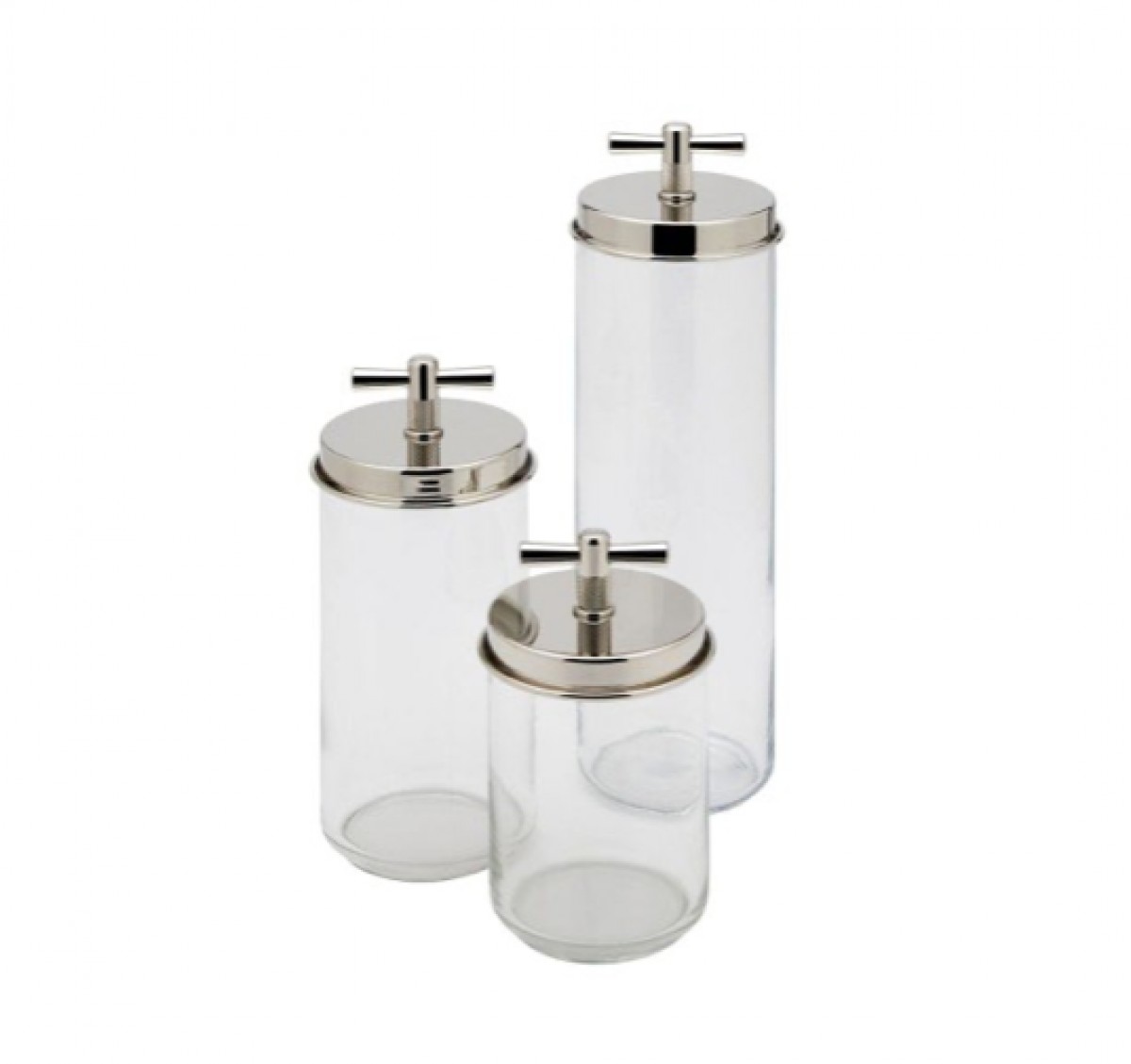 Waterworks exclusively designed storage jars transcend utility when capped with hand-knurled air-tight lids in nickel or brass. Available in a set of three assorted sizes or a single large jar, the ornamental pieces will efficiently store food and add interest to a space with their industrial-inspired tops.