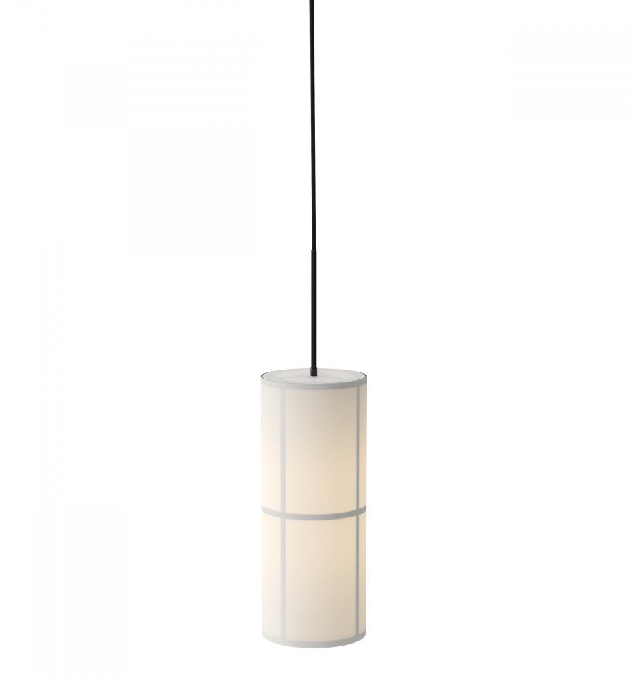 The collection’s pendant light is created with the same column-like shape as the floor and table lamp, carefully covered with translucent fabric that reveals the graphic structure within and suspended from the ceiling by a textile cord. Spreading ambient light in a room, it makes a purposeful pendant above a dining table, in a reception area or hotel bedroom.