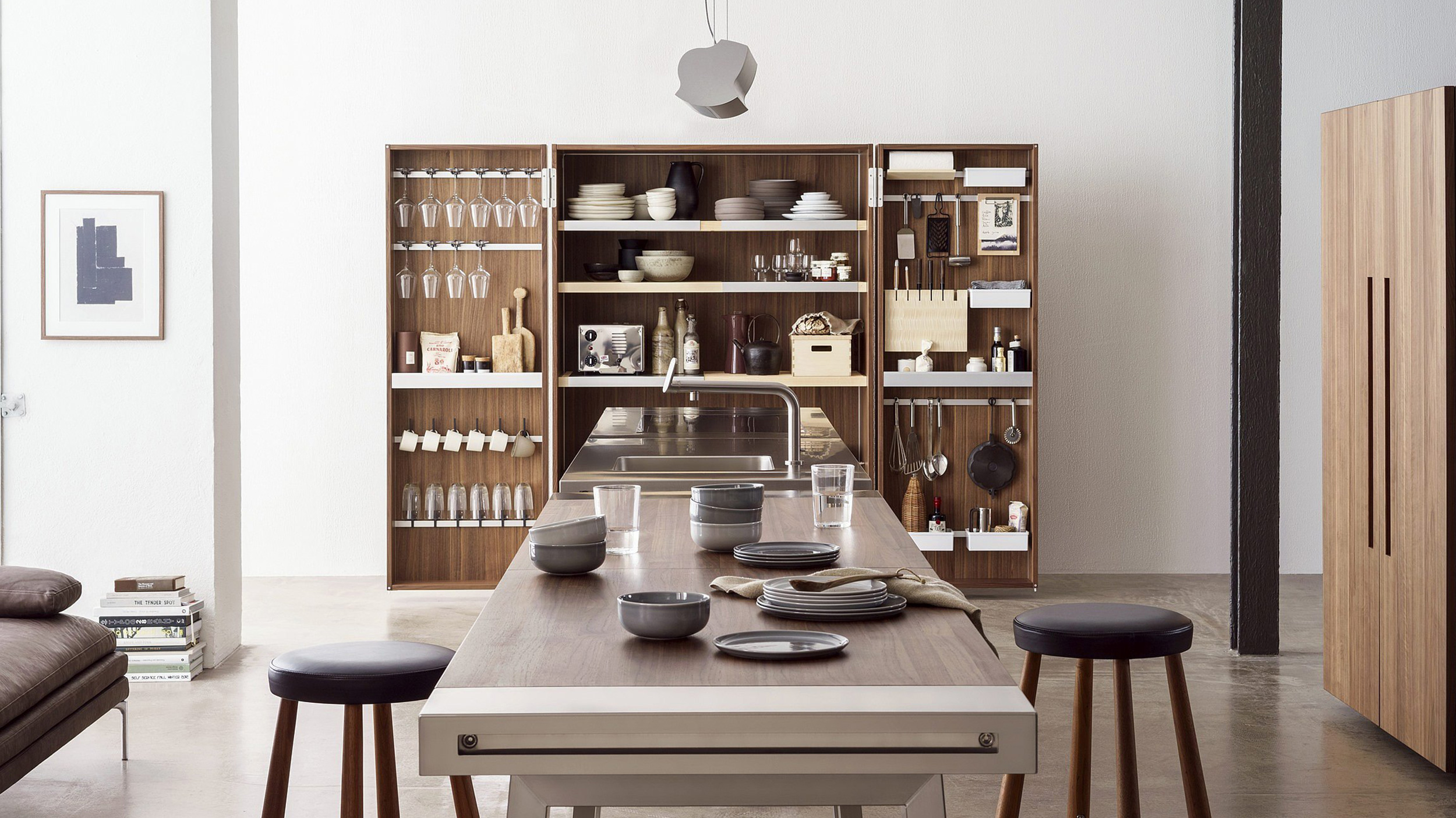 The cabinets beautifully display kitchen equipment while being the ultimate storage solution. When not in use, they can be closed for a seamless appearance. The multi-functional workbench features an open space that provides uninterrupted movement and serves as a work surface, water point and eating area.