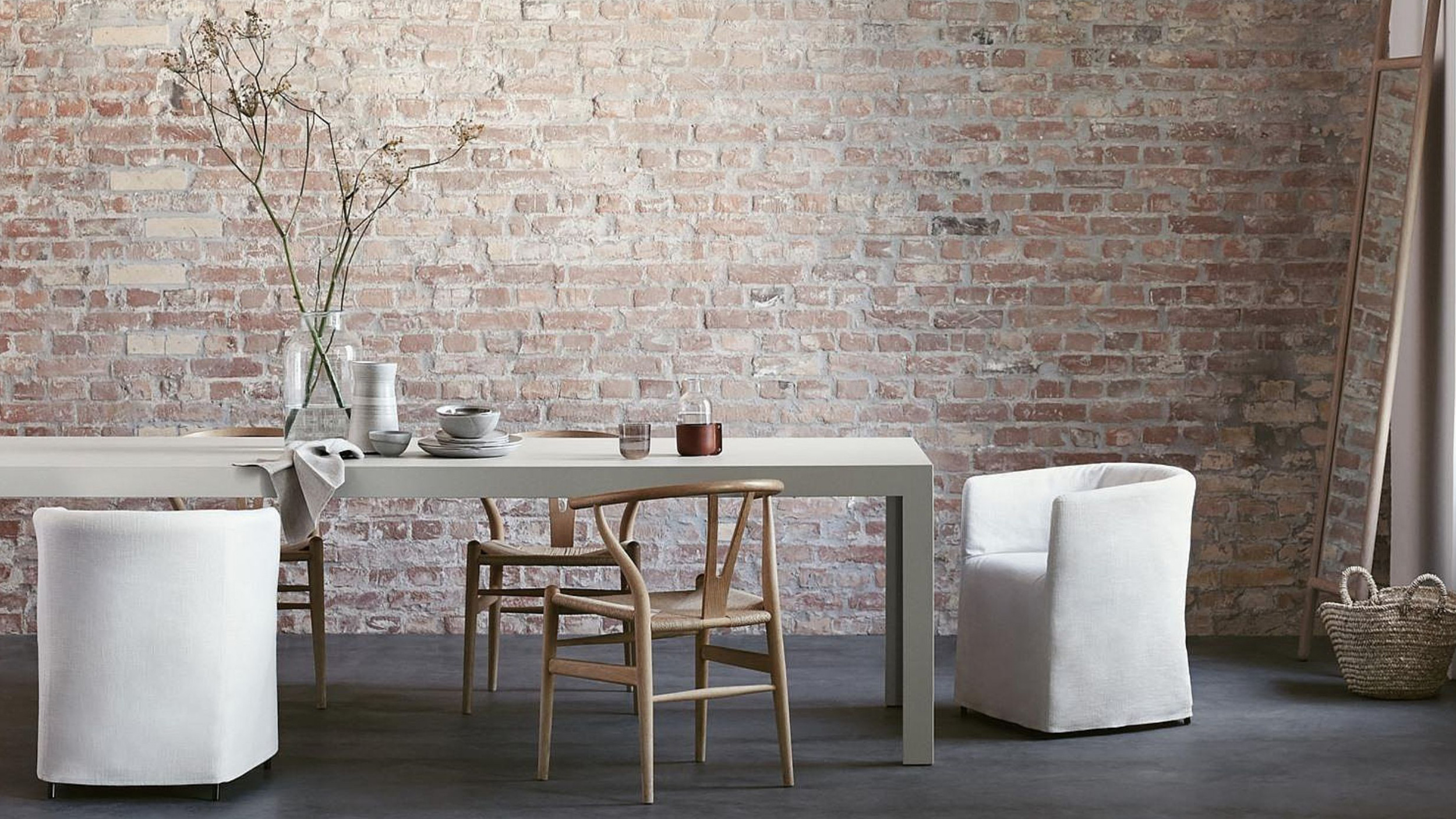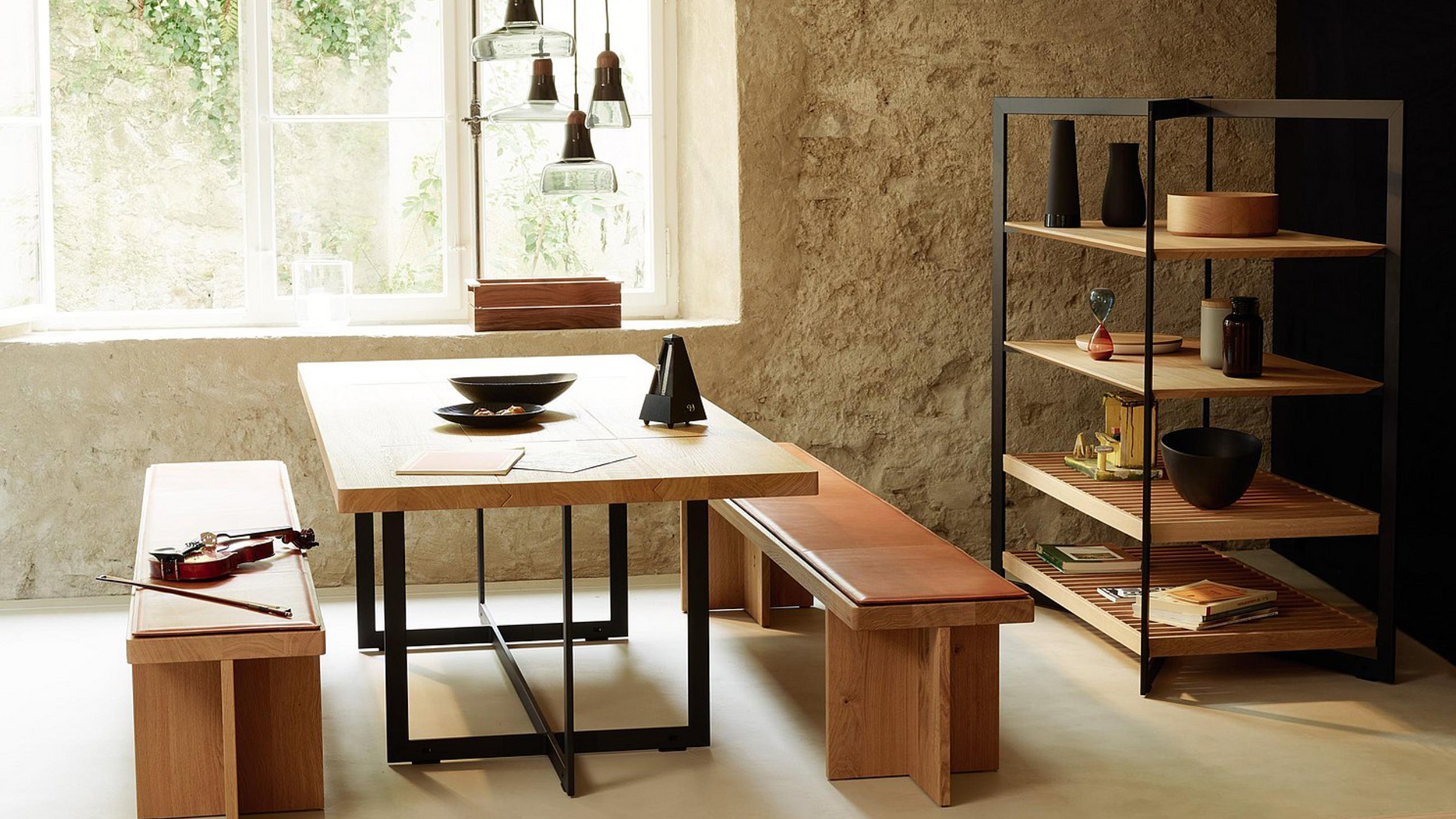 The storage unit has three variations: glass, oak and stainless steel. All provide handsome displays of your treasured objects and everyday essentials. The table and bench are made of solid oak with a natural tanned leather seat cushion, creating the perfect space where you gather and create new memories.