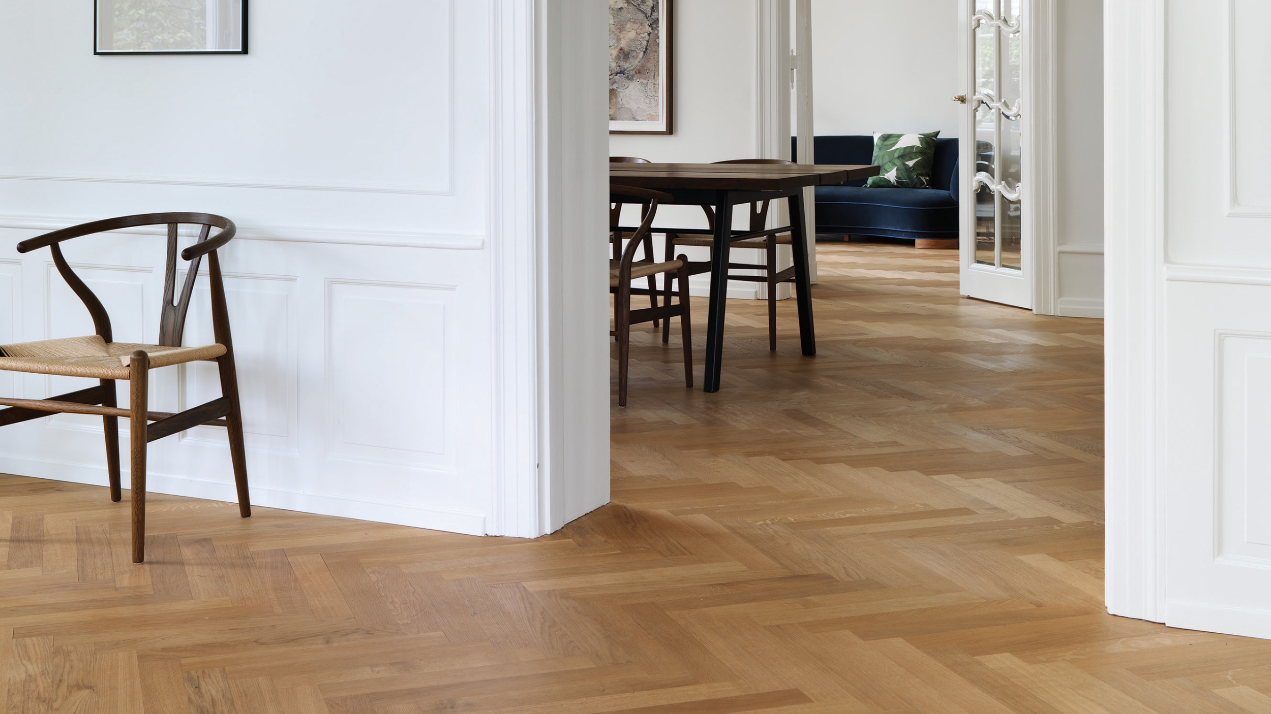 With Dinesen Layers, you get an engineered floor of the high quality that characterizes Dinesen’s plank floors. Dinesen Layers Oak distinguishes itself from other lamella constructed floors as it consists of three quality layers that are pressed together with a reverse middle layer – all in European Oak. An elegant and subtle solution.