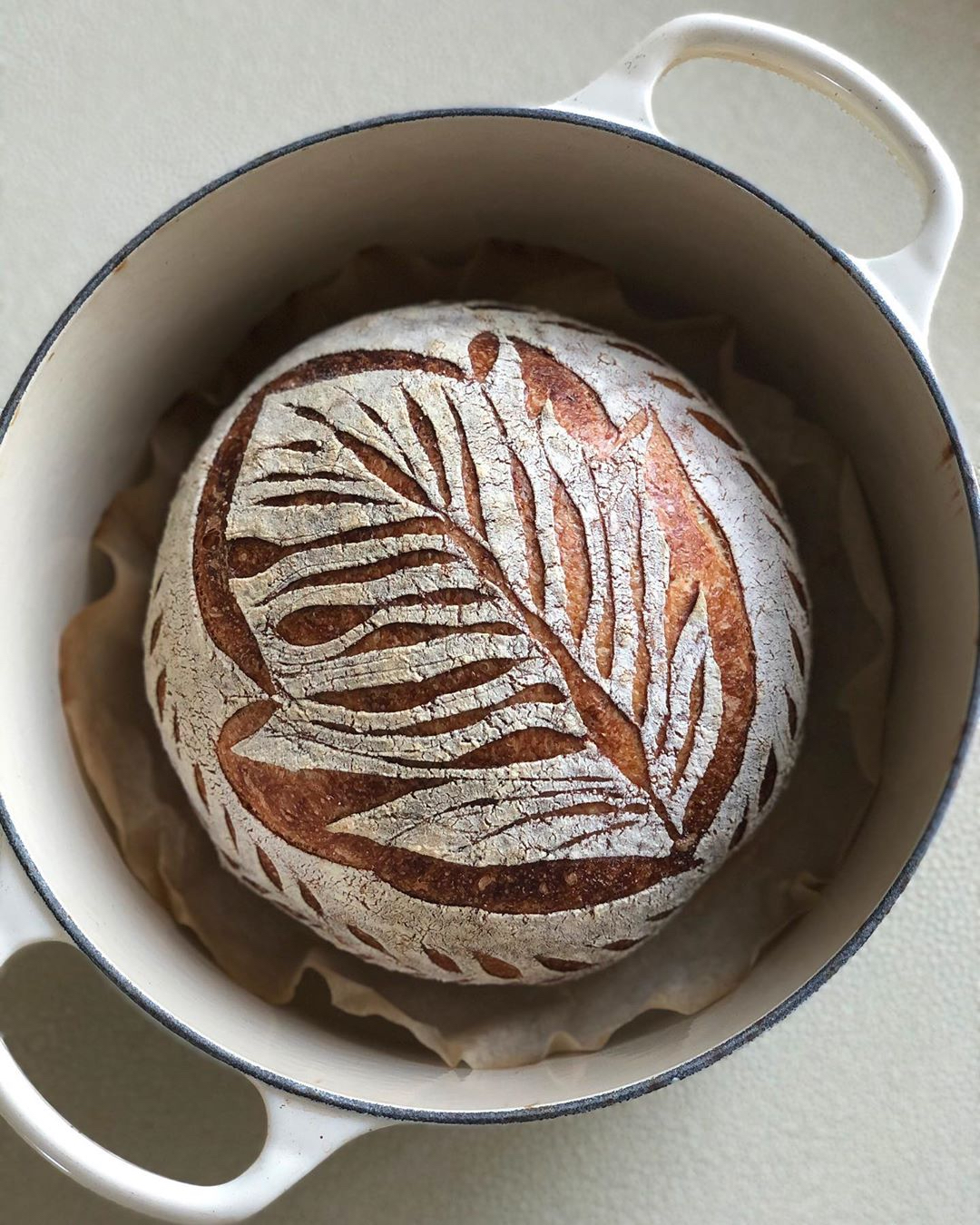 Beverly is not alone. Across the world in the UK, Owen, an avid sourdough baker who goes by @_flour_salt_water on Instagram is also using his close proximity to the kitchen for the better. It’s on his popular Instagram account that Owen shares his beautifully decorated loaves and uniquely practical sourdough recipes.